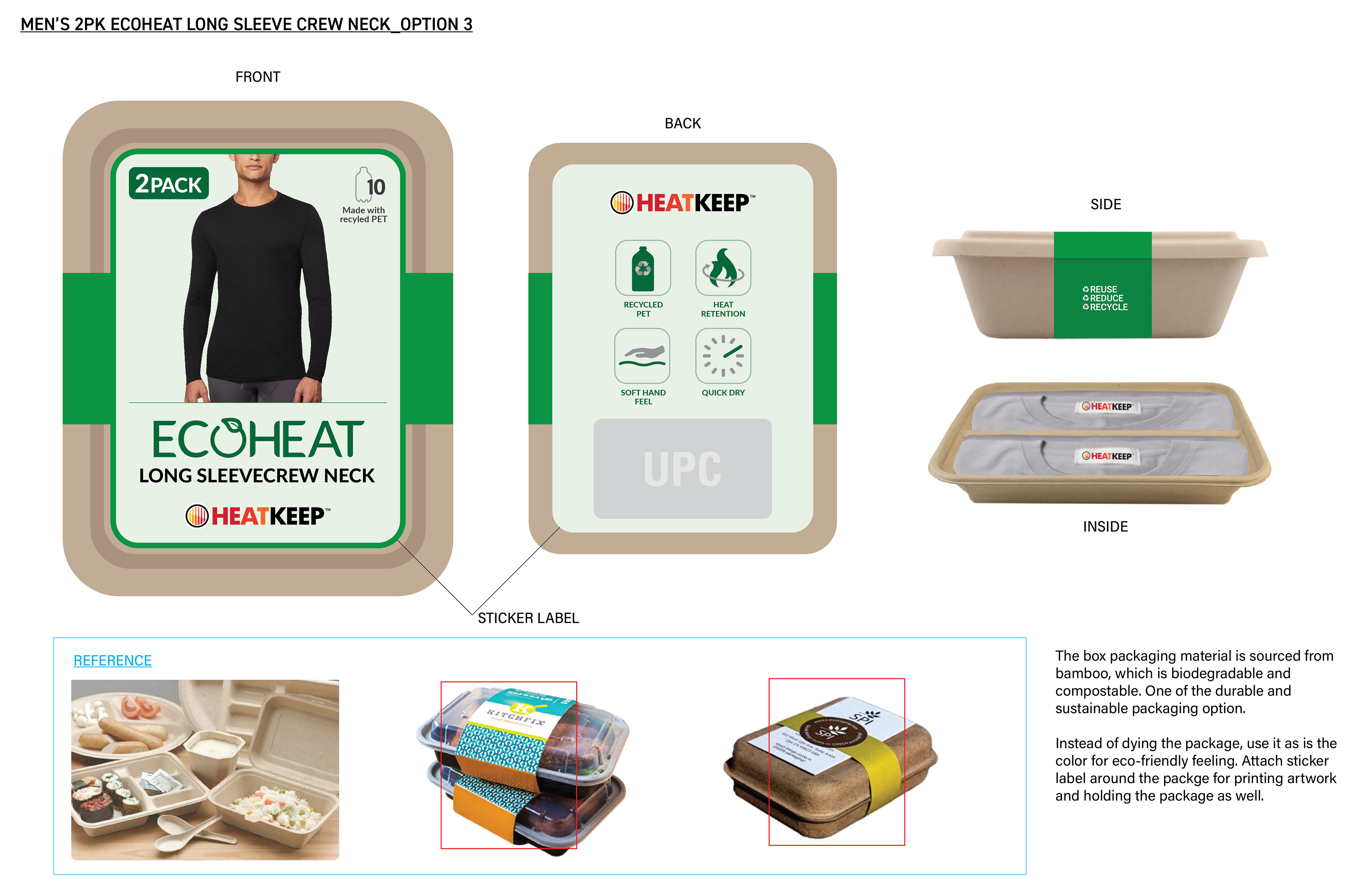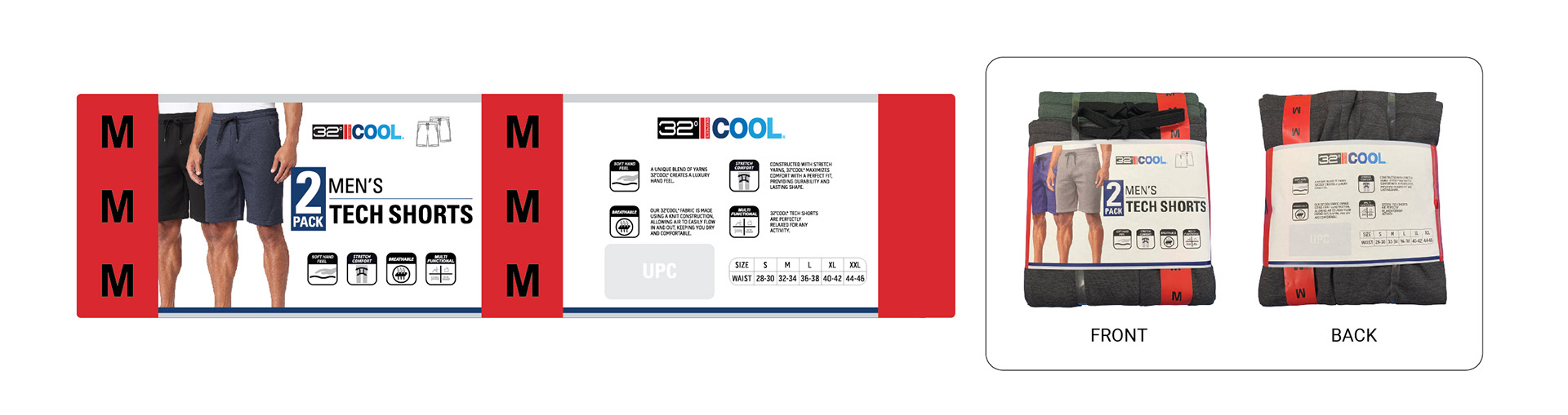 The first design among the below options is SS'21 Men's 2 pack shorts sold to the Costco table program. Below three are the options we prepared for updated versions of Men's 2pk shorts packaging for next season's buyer's meeting. The front and back images on the right are the handmade packaging mock-ups (it shows the idea of how will the actual samples look like).
