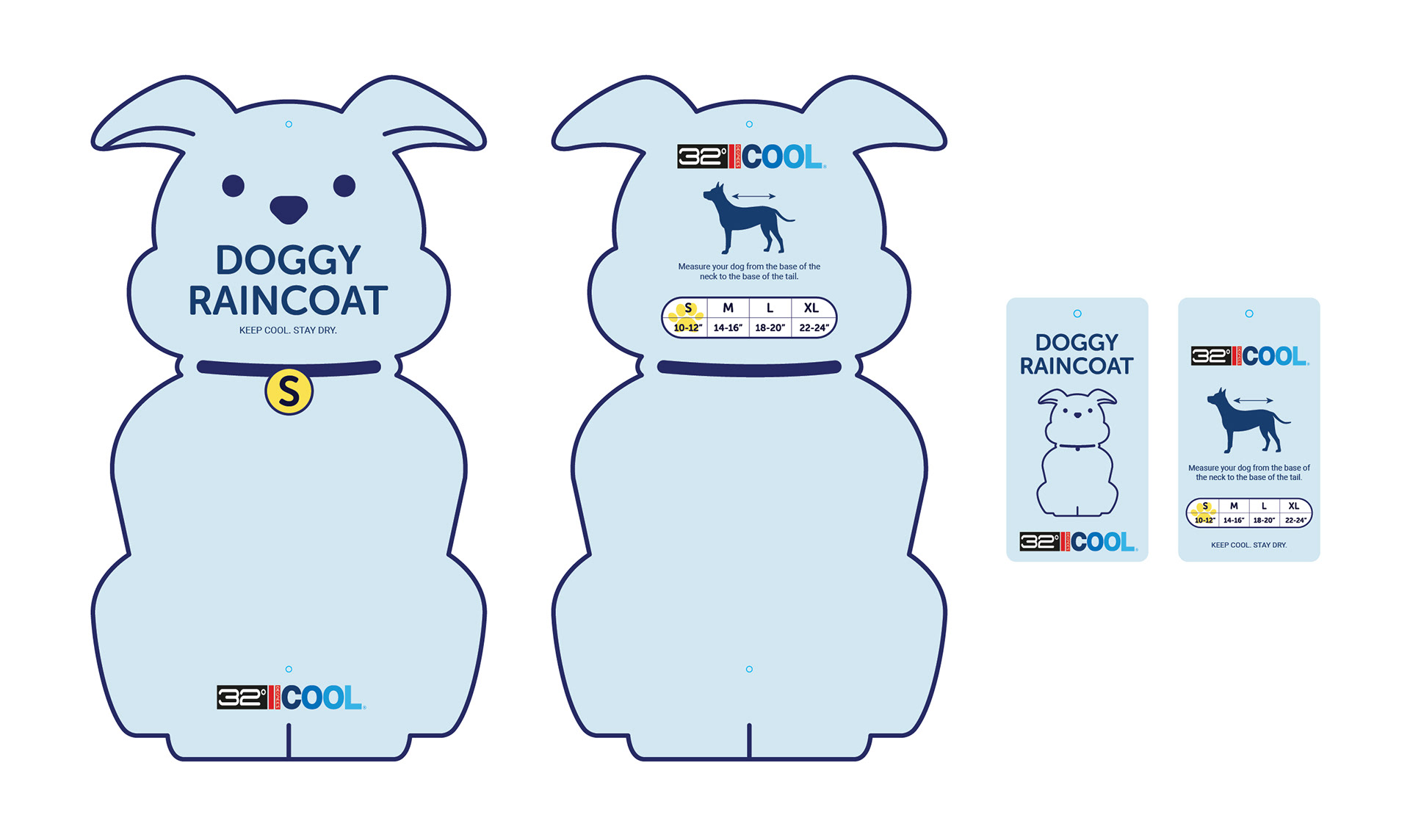 The doggy raincoat packaging concept was developed for the department stores as well. They were looking for a hanging style packaging for doggy wear. We made the whole packaging concept is imitated from a dog shape, and it can be used as a hanger itself. The raincoat puts and wraps around the neck part, and it gives you a look at when your dog wears the raincoat.