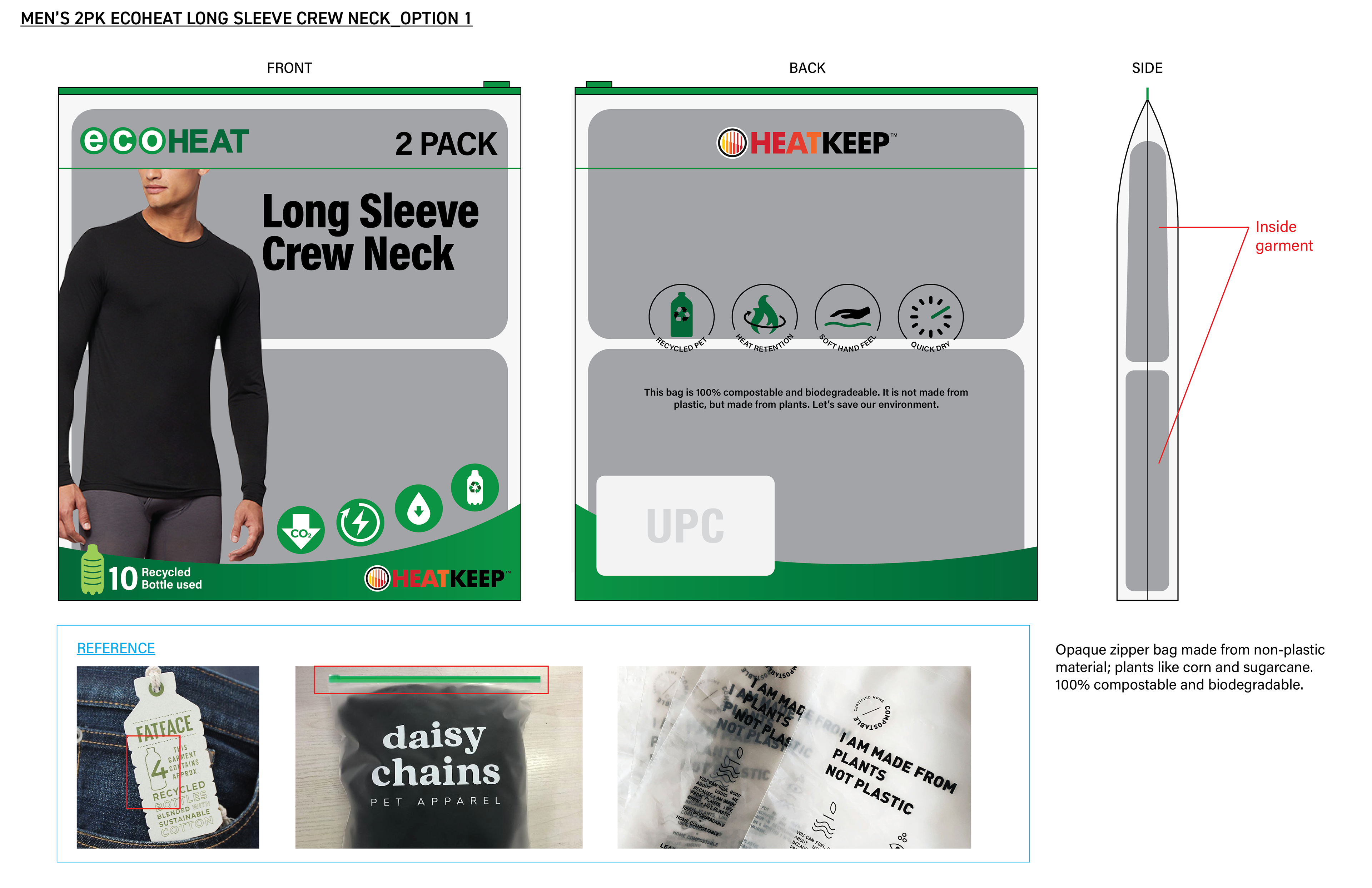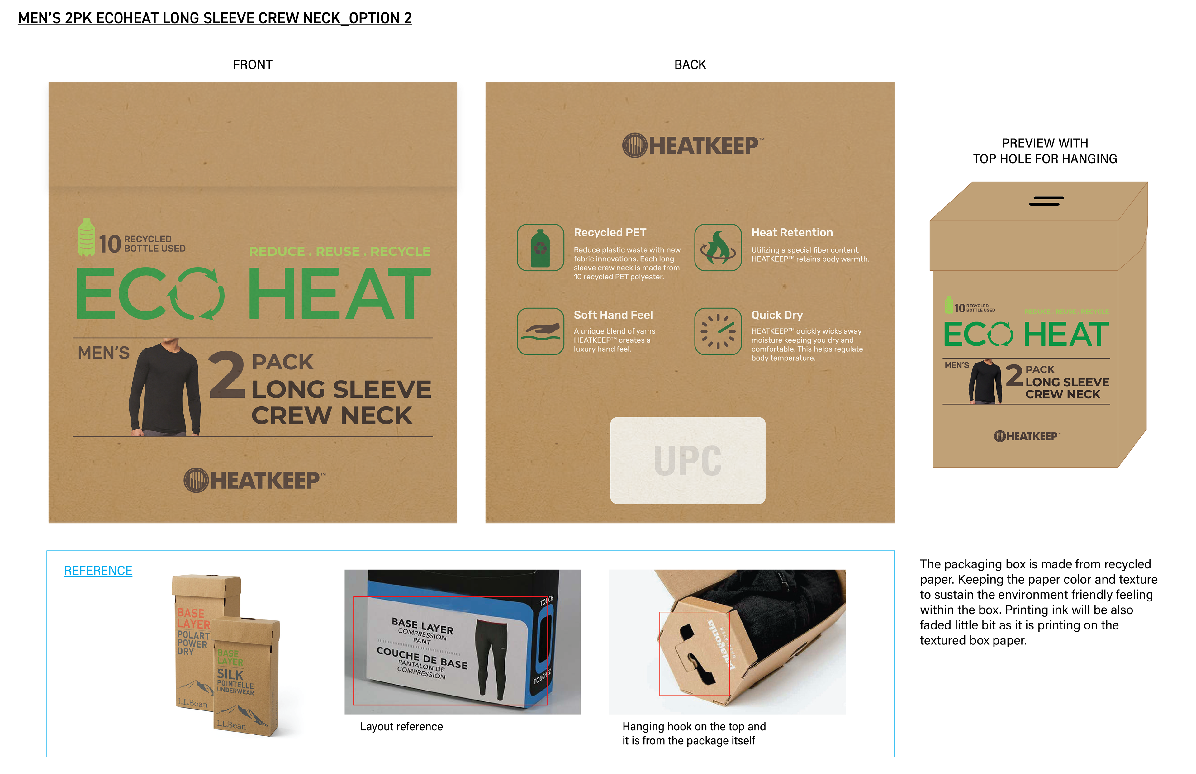 As lifestyle retail brand, when we look out for where the fashion industry is heading in the future, we found that we cannot leave the environment behind. We considered how we can help our customers save our environment together. We are under development process of the sustainable garment made from plastic recycled polyester and all packaging material is from biodegradable. Long sleeve crew neck is one of our best selling product line and HEATKEEP is a sub-brand of 32Degrees for a specific department store.