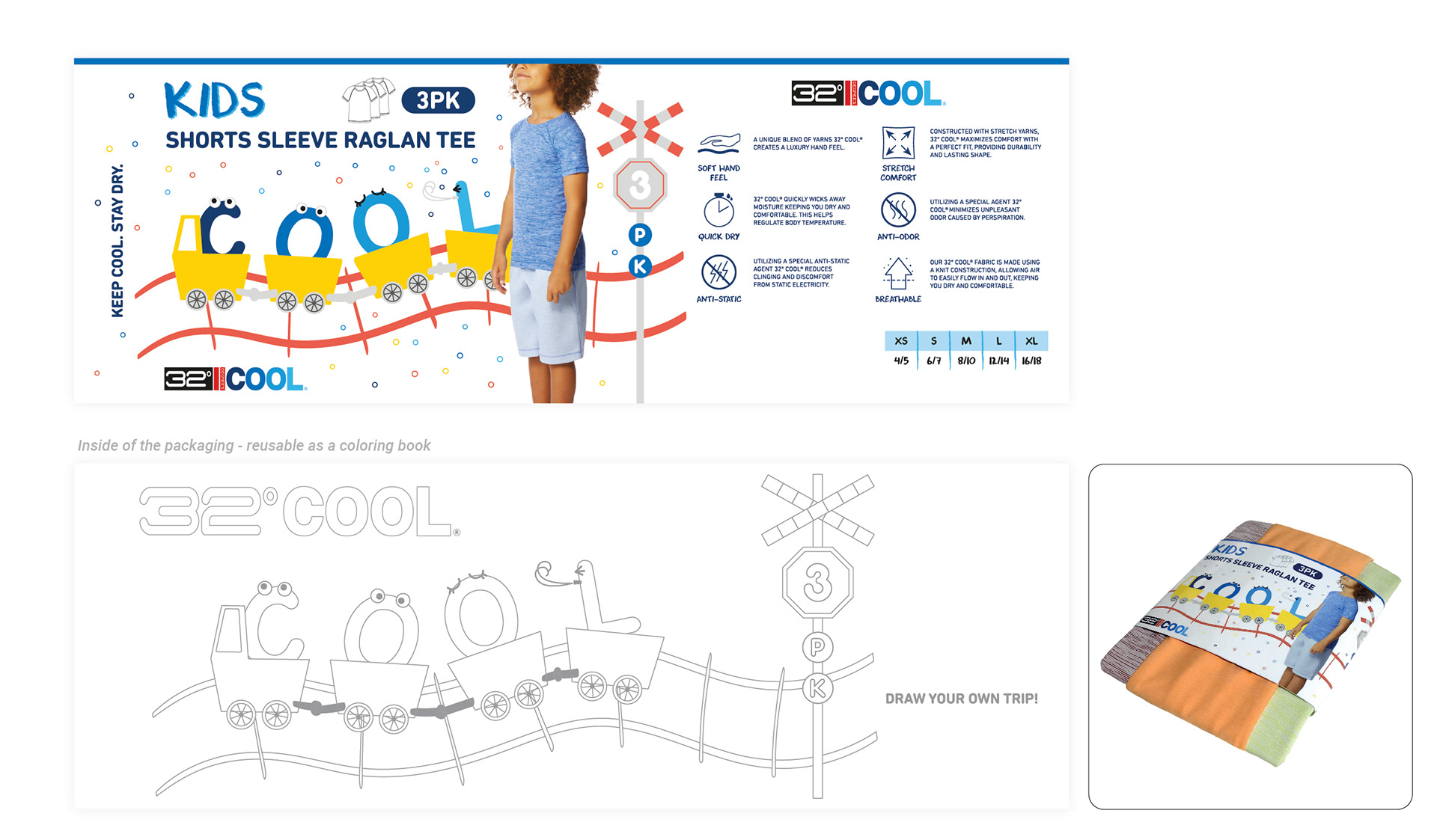 Our team researched and prepared the presentation of design concepts for each season. We aimed to maintain the overall branding concept but updating the current packaging with the new structure and design trends. The packaging is usually coming out in boxes with PDQ boxes and plastic zipper bags hanging on the rack, but we came up with a reusable belly band packaging concept for 3pk kids' t-shirts for the Costco store table program. The customers can use the packaging as their kids' drawing/coloring sheet on the back of the packaging instead of throwing it out right away. We tried to develop packaging ideas to attract customers among the competitors.