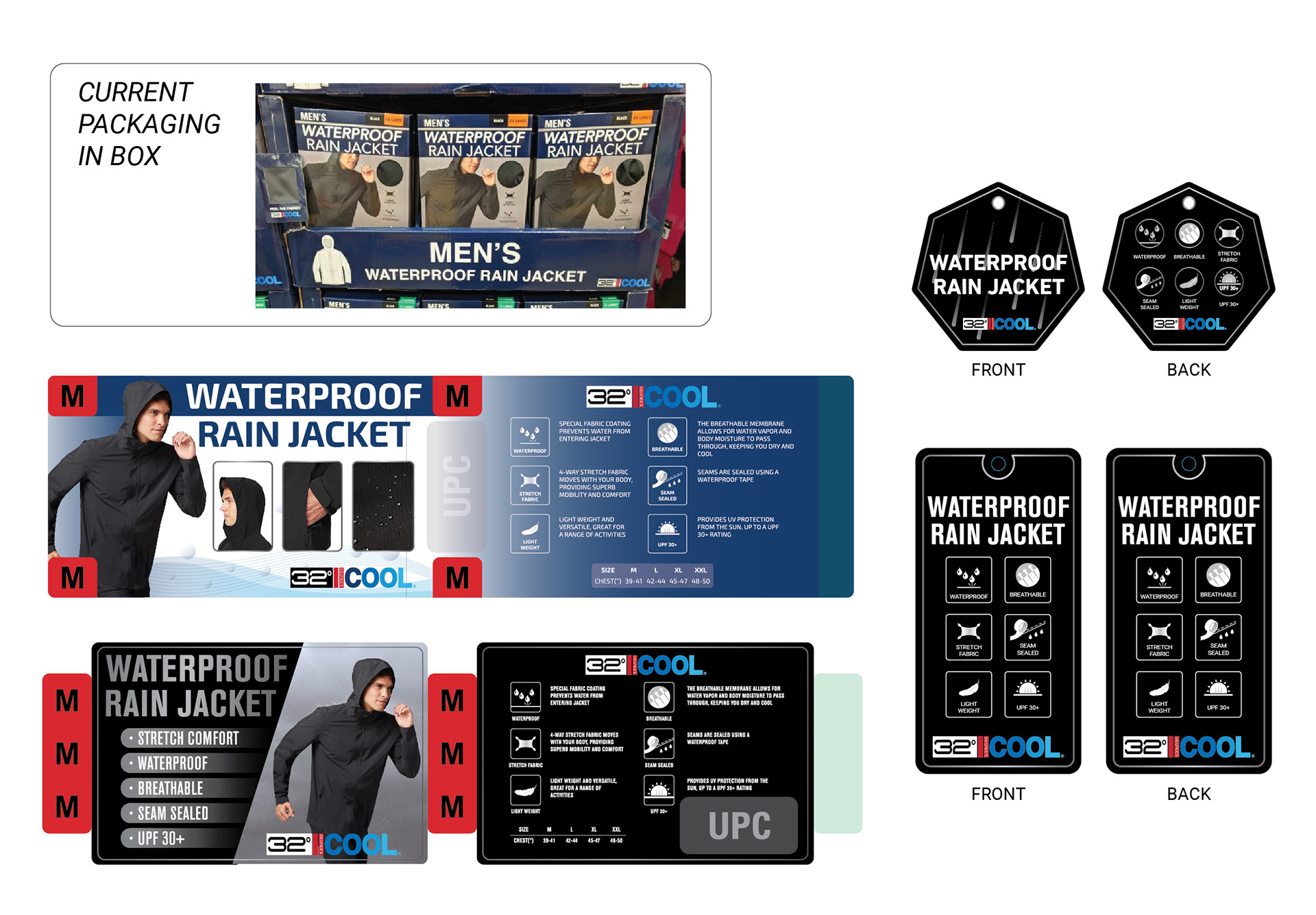 Current SS'21 Men's rain jacket is selling in box packaging as shown below image, and usually, Men's rain jacket was sold in a box packaging with PDQ boxes to Costco stores. However, we tried to show them different program options in a belly band and hangtags for the upcoming season.
