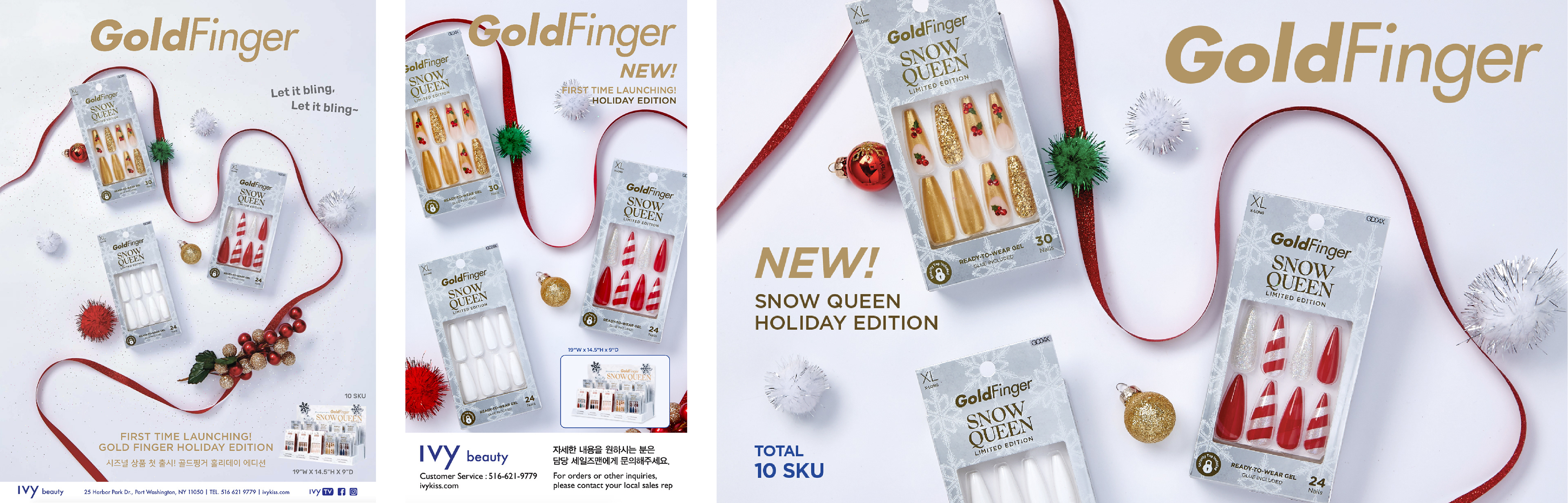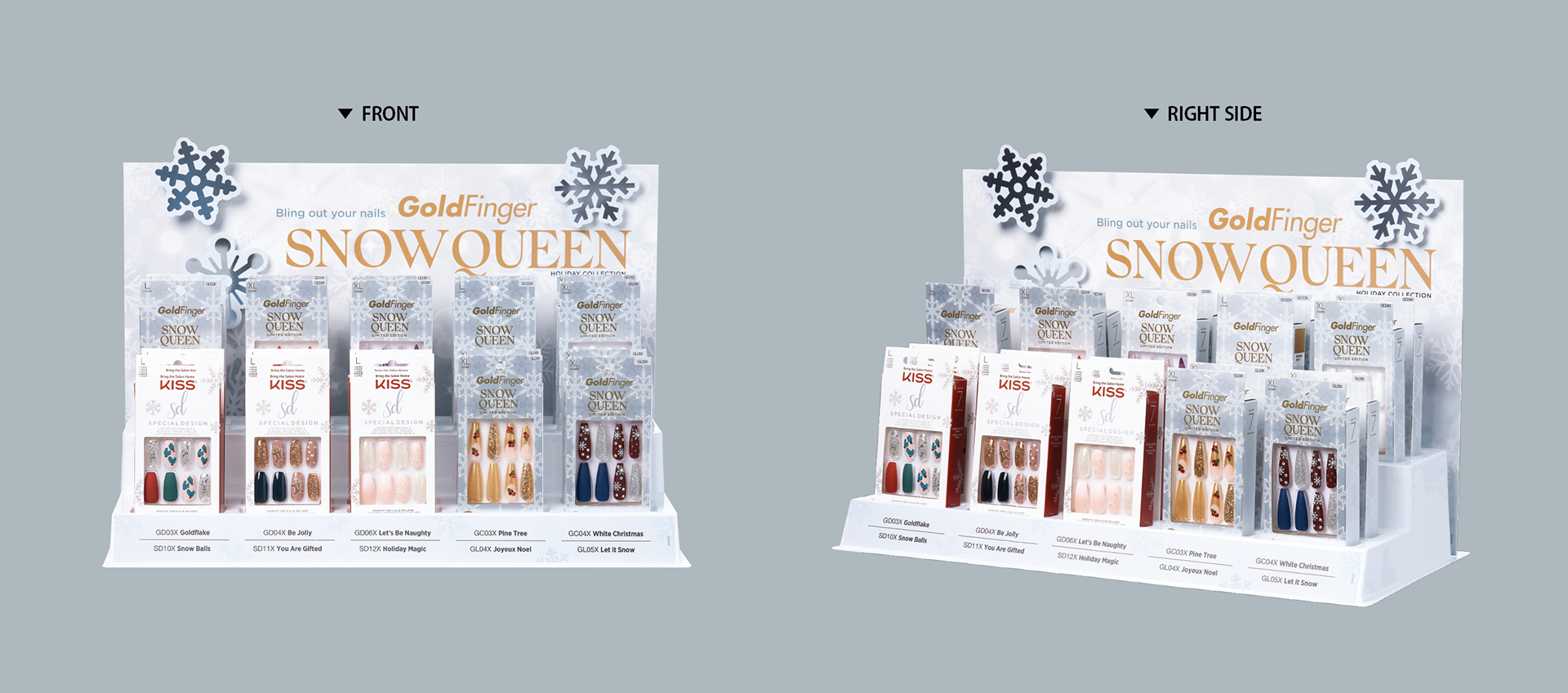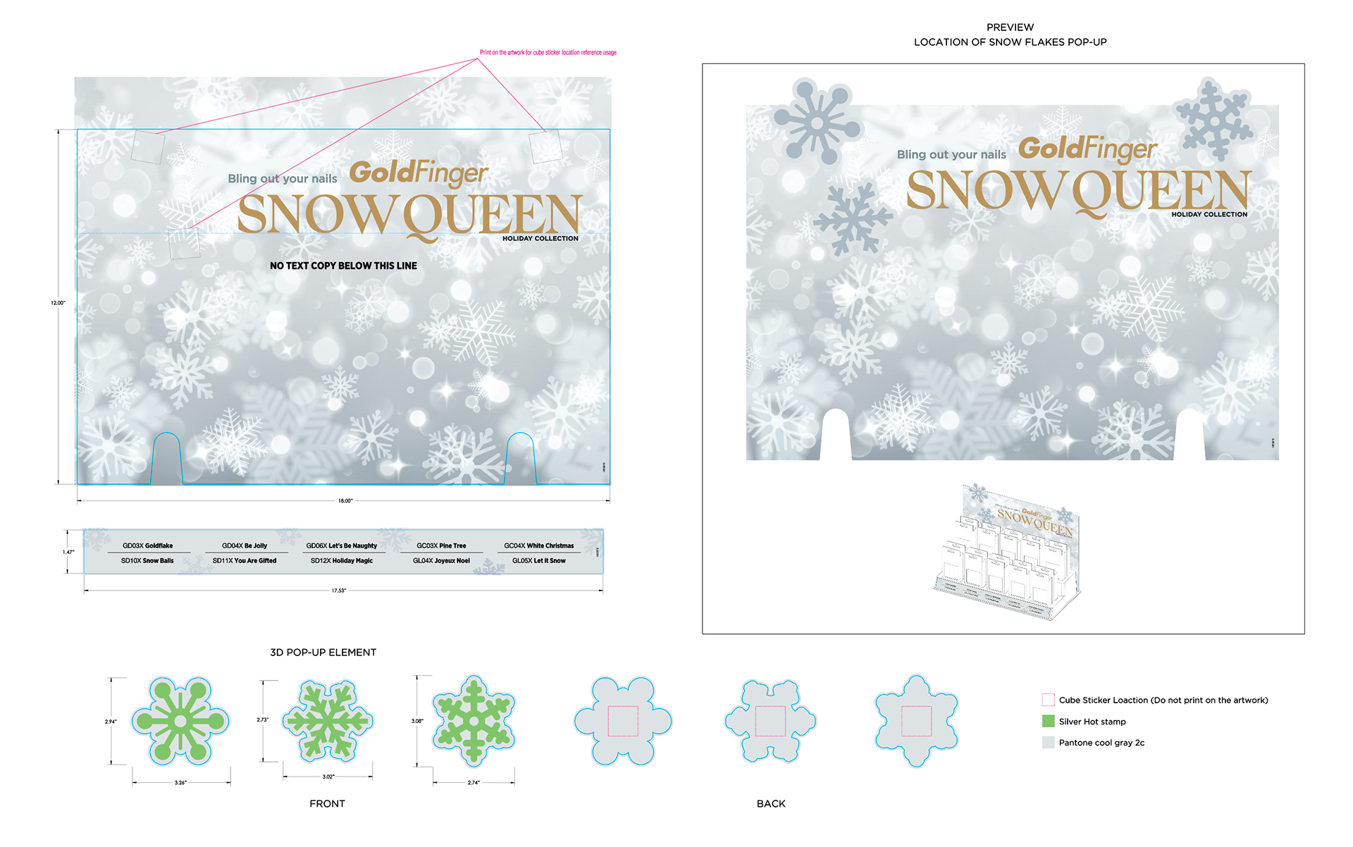 Designed a holiday nail set collection (10 variations) with a custom countertop display for beauty supply stores and drugstores. The Snow Queen-inspired concept featured silver and white packaging, with 3D pop-up snowflakes added for a playful, eye-catching finish.