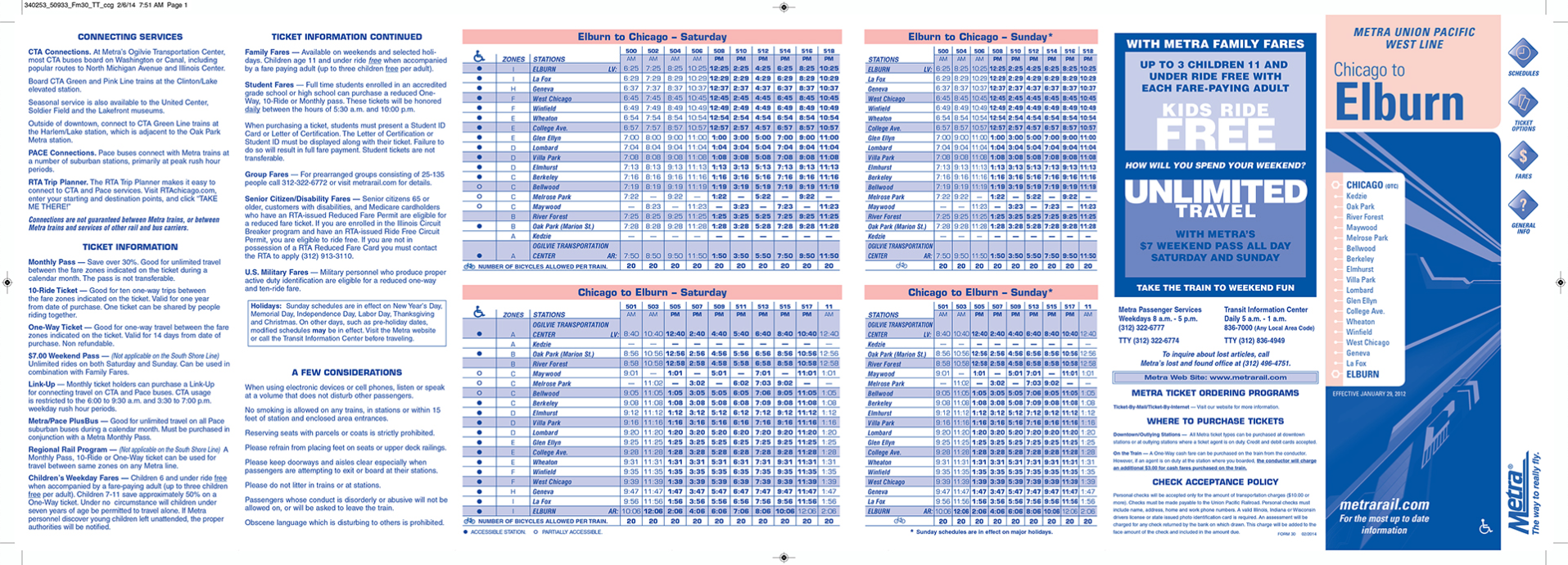 Redesigned Illinois transportation METRA time table scheduled in both ways from Chicago to Elburn. The time table includes weekly schedule, fares, ticket information, and other related considerations. The placement of contents mostly stayed the same overall, but cleaned up the hierarchy and changed the color theme to black and white to keep it clear and legible.